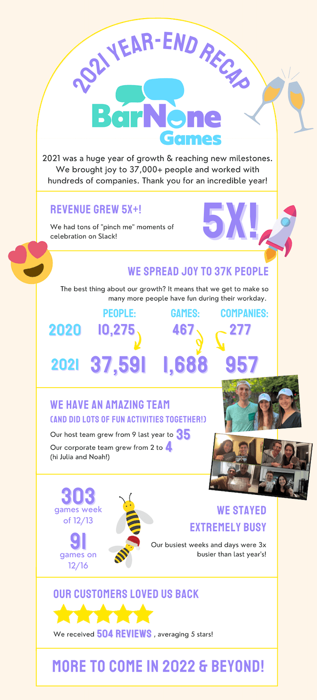 We are excited to see many new and returning participants over the next year and can't wait for our next chapter (new games, tech, branding, and more to come!). Until then, we wanted to take a minute to look back on a 2021 spent laughing, playing, and connecting with each other.