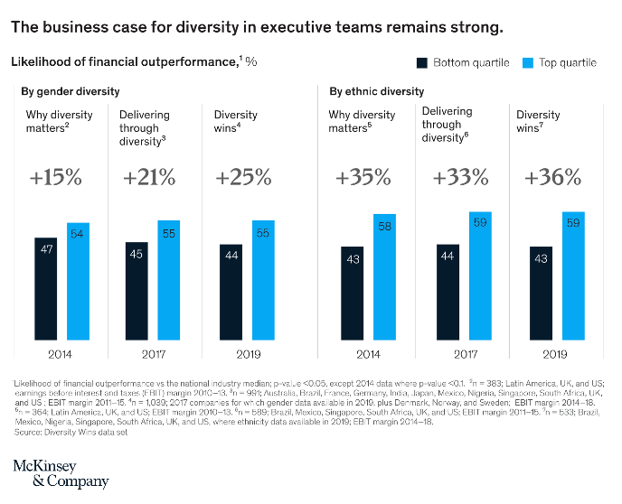 Diversity and inclusion for teams always wins. There’s never been a stronger case to ensure that your team acknowledges and celebrates diversity and inclusion. Research from McKinsey shows that diverse teams consistently perform better. Teams that are diverse, whether based on gender or ethnicity, are expected to financially outperform by 25-35%+, than if they were not diverse. Having different viewpoints mean that your team is better able to adjust in an everchanging environment and it can be a company’s competitive advantage.